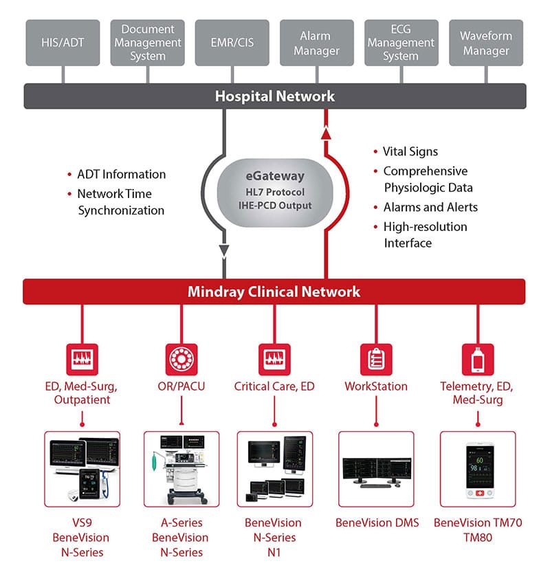 The Mindray eGateway Integration Solution is a powerful informatics component for bi-directional communications between networked Mindray clinical solutions and hospital ADT, CIS, EMR, and alarm management systems. Interoperability is simplified through the adoption of standard HL7 protocols and the IHE PCD profile for seamless connectivity.