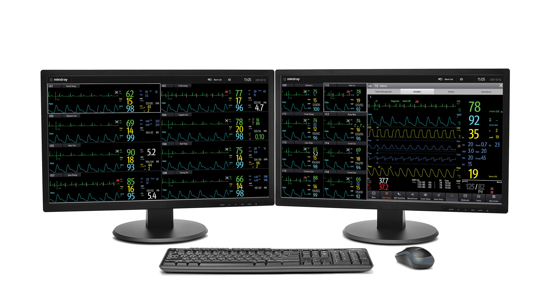 - WorkStation with up to three widescreen displays supports monitoring up to 64 patients across care units