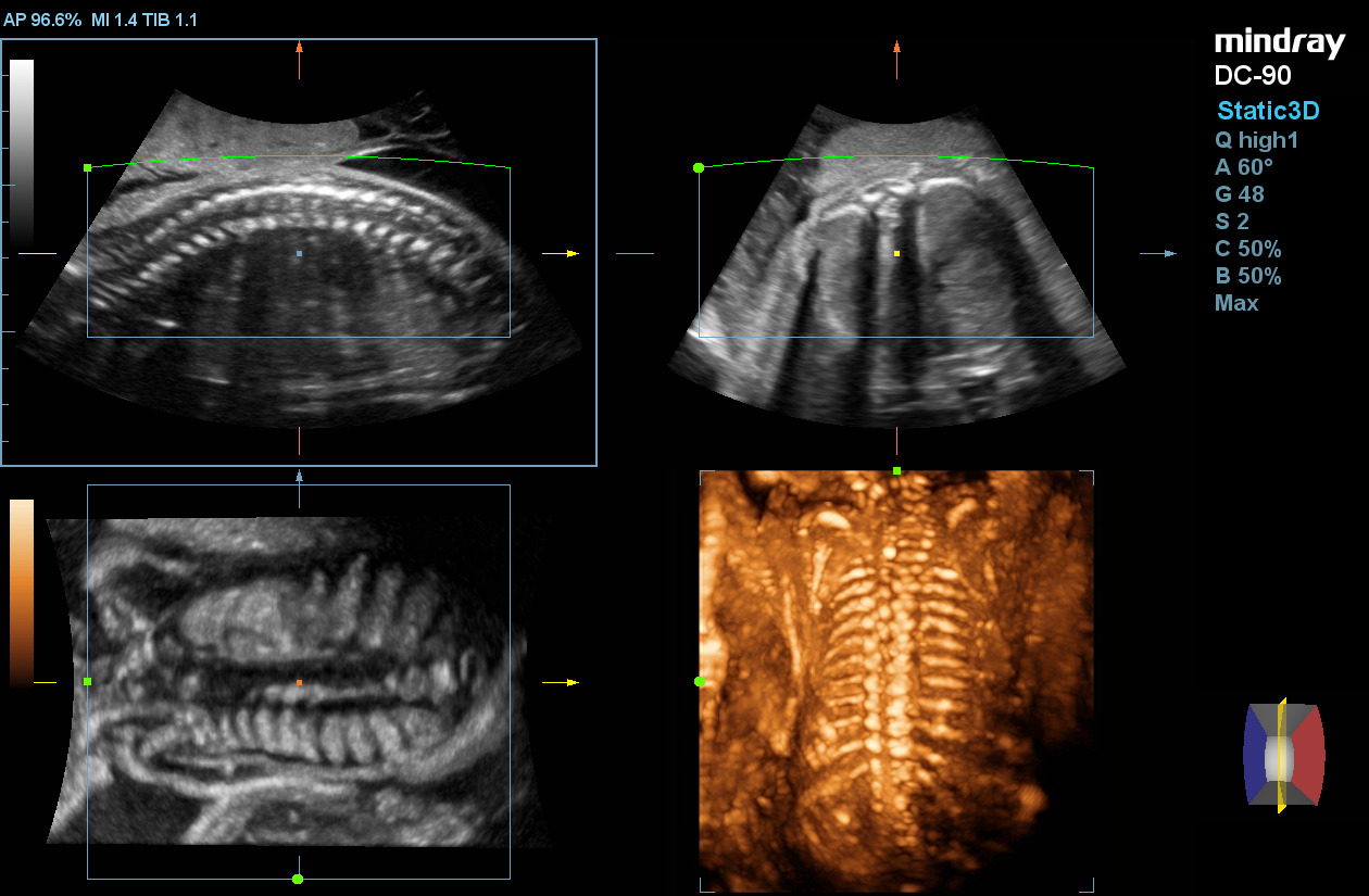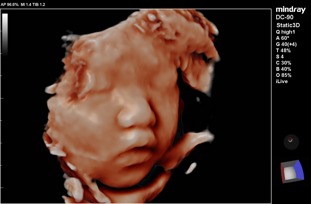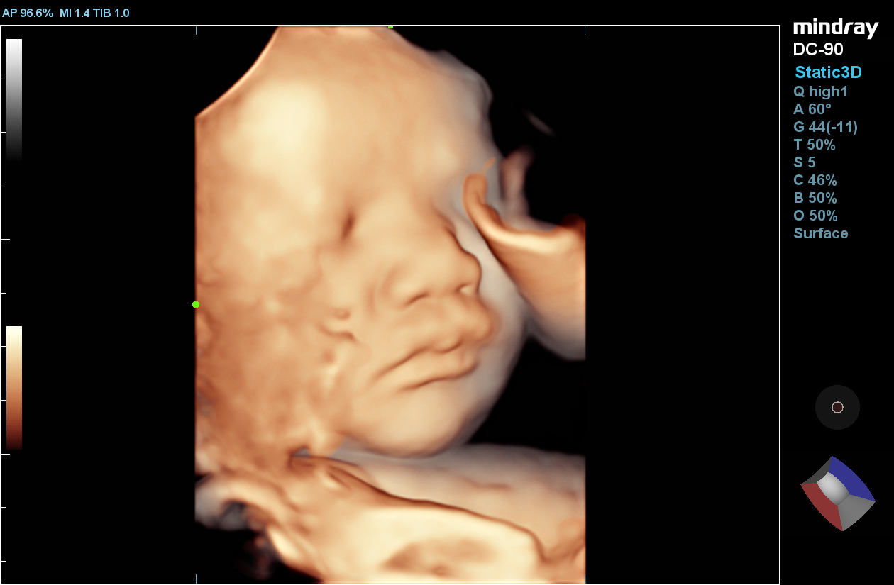 Smart Face provides a fast and intelligent optimization for fetal face with simple one-touch operation. It can immediately remove occlusions such as cord, placenta, uterus, and extremities in the volume data, to generate an optimal view of the fetal face.