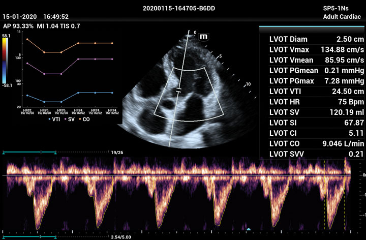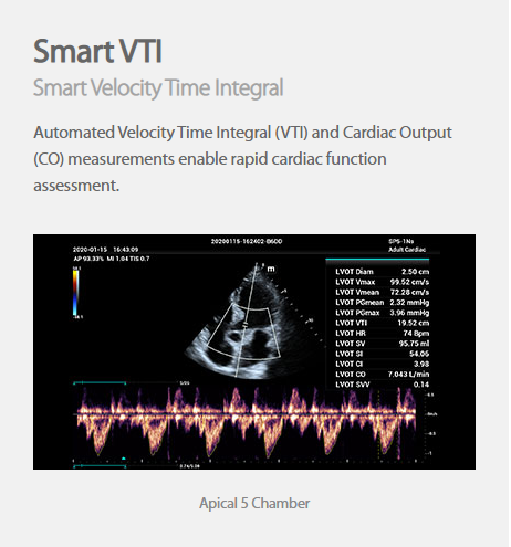 Automated Velocity Time Integral (VTI) and Cardiac Output (CO) measurements enable rapid cardiac function assessment.