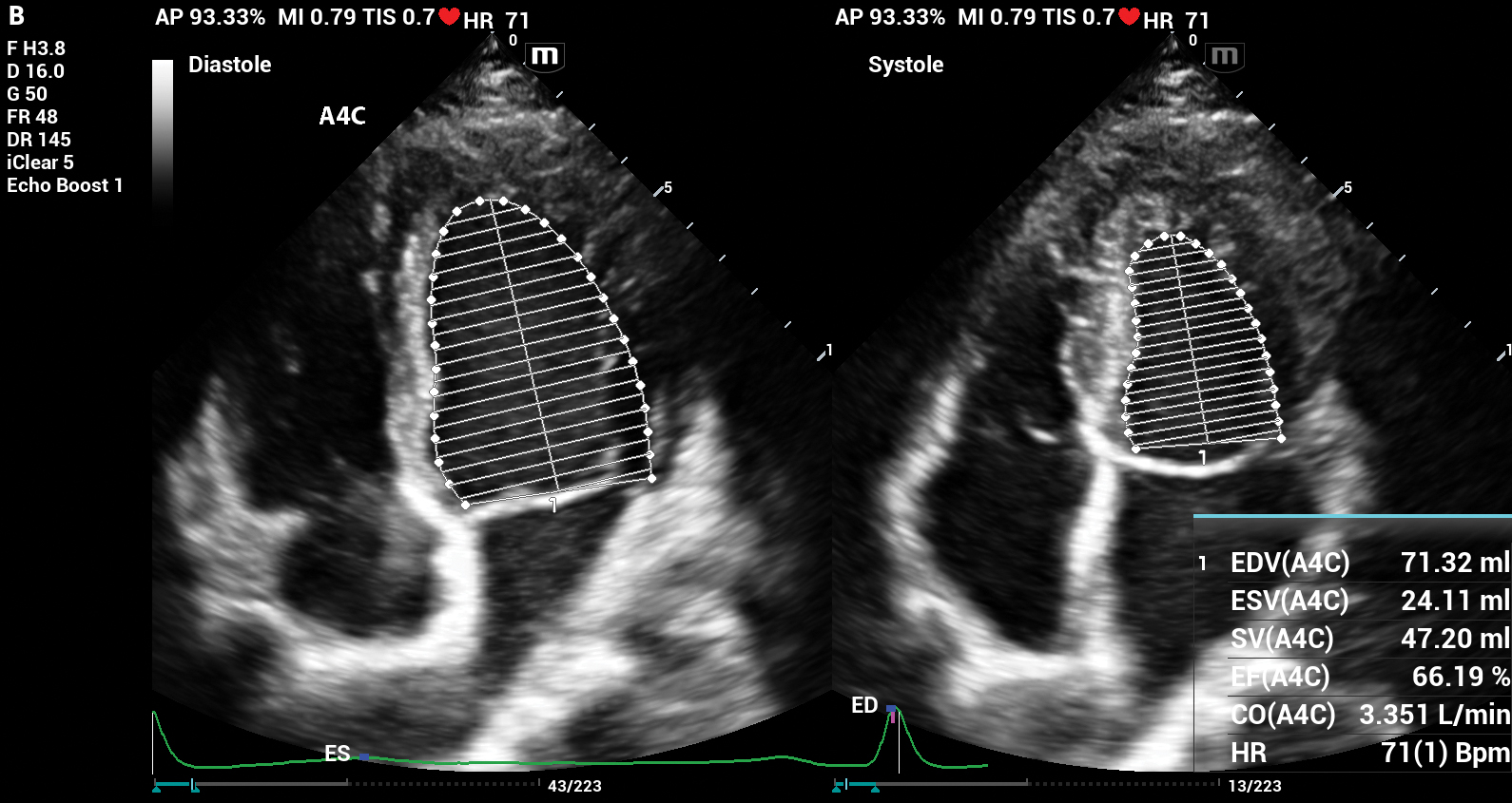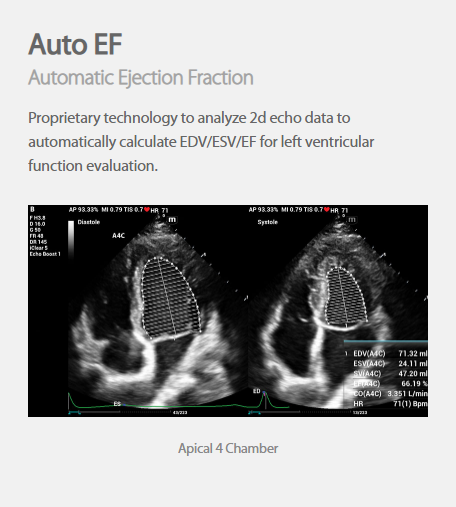 Proprietary technology to analyze 2D echo data to automatically calculate EDV/ESV/EF for left ventricular function evaluation.