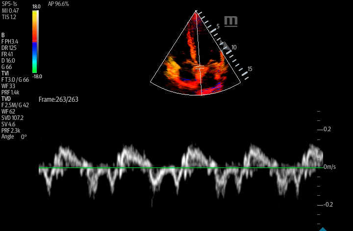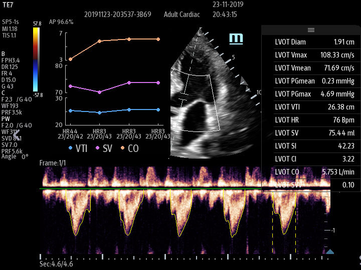 Automated measurement of the Velocity Time Integral (VTI) and Cardiac Output (CO), enables rapid assessment of cardiac function. This software automatically locates color box and Pulse Wave Doppler (PW) sample line in real time. A graph of parameter trends for CO, Stroke Volume (SV) and VTI is produced to guide decision-making.