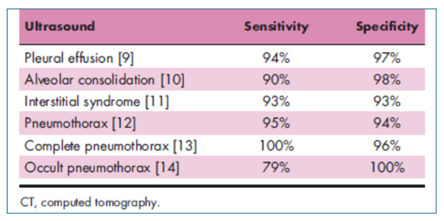Figure G. Shows the accuracy of lung ultrasound in the critically ill compared with CT.  Source Lichtenstein D, Curr Opin Crir Care 2014:20:315-322.