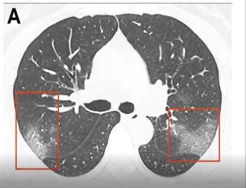 Figure B. CT scan of a positive COVID-19 patient. The red squares highlight the bilateral peripheral and basal ground glass opacities.