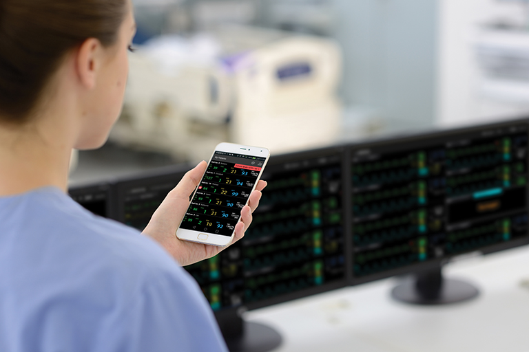 BeneVision telemeters inherently provide clinicians immediate access to timely and relevant patient data including visual confirmation of electrode signal quality, historical events, real-time waveforms, alarm settings, and protected access to Protected Health Information (PHI). The telemeter, combined with customized workstations in the department or remote workstations between facilities, significantly reduces the need for verbal communication with centralized monitoring staff or isolated review at the nurse’s station. For remote viewing, our tablet/laptop and smartphone software applications (CMS Viewer and Mobile App) provide real-time comprehensive or clinician-centric views of your patient’s data and support both iOS and Android platforms.